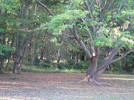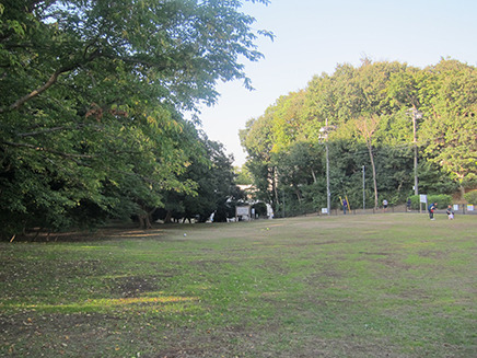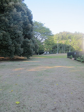 - 芝生広場の奥は木が生い茂っている。