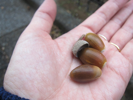 - “ドングリの林”と書かれた木の前にはベンチがある。