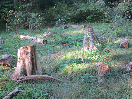 - 駆除対象種の木や間引き対象種の木を伐採して保全育成種を増やしている。
