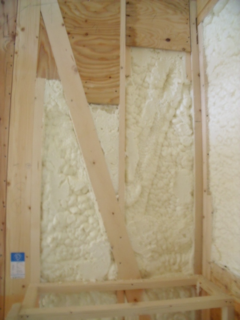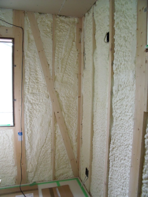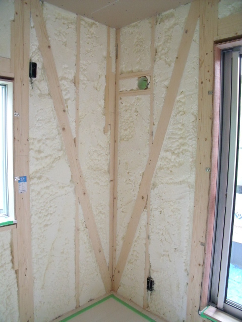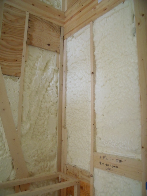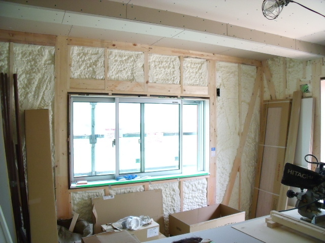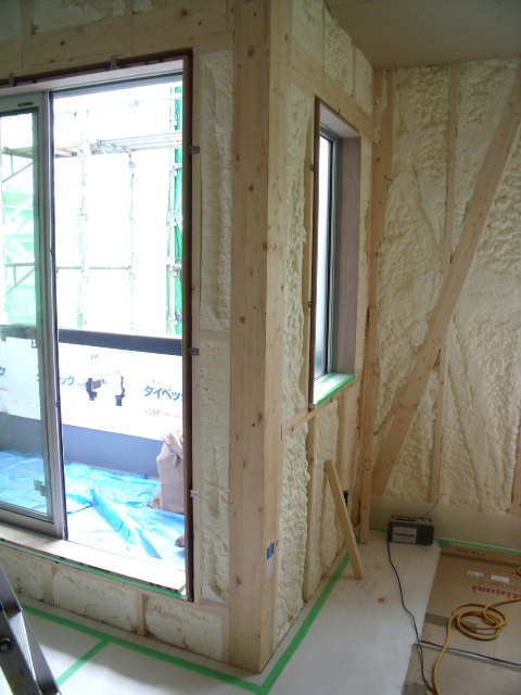 完成後には見えませんが、大きなサッシのある周りの狭い壁にもびっしり泡断熱が施工されています!!