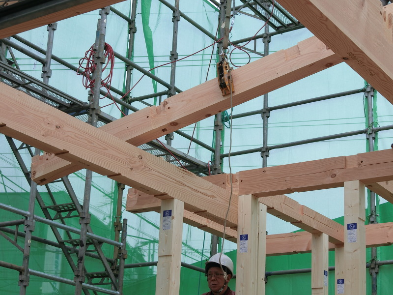 右の写真はプレカットを組み合わせた木材を職人さんがハンマーで組み合わせています。