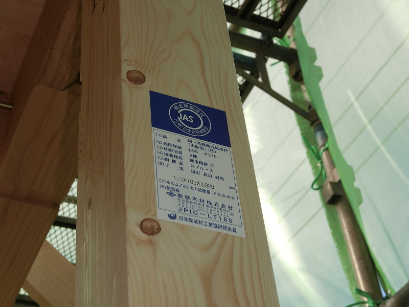 右の写真、ステッカーは、JAS規格に適合した安全な集成材を使っています。