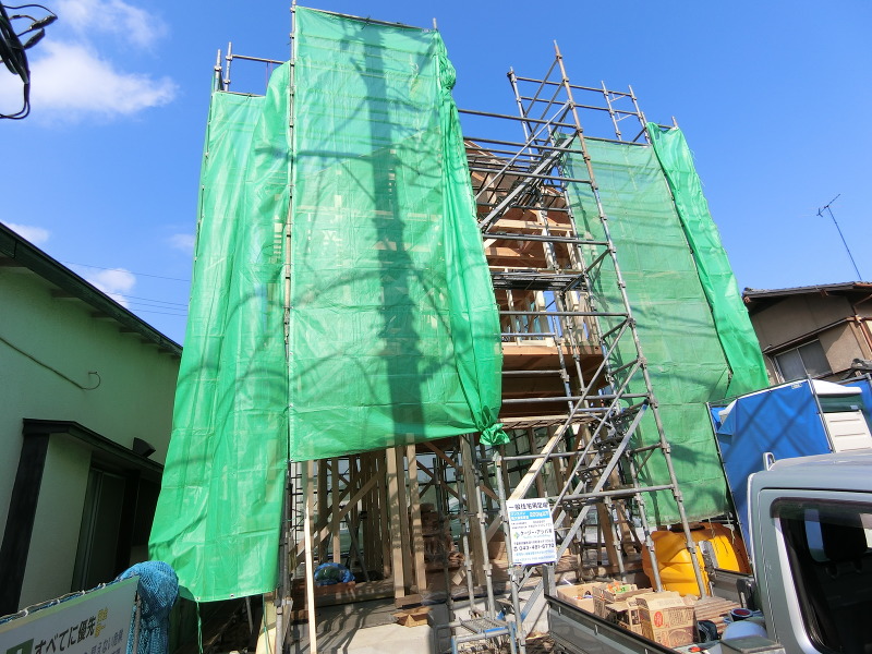 騒音やホコリが風で飛んでいくのをを軽減するため、足場にはシートがかかっています!!