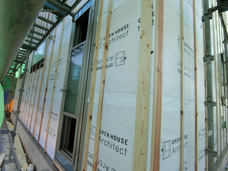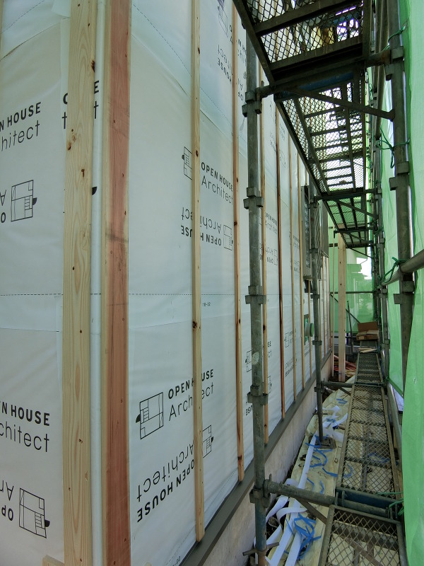 下地材が打ちつけられ、外壁材との隙間を設けます。