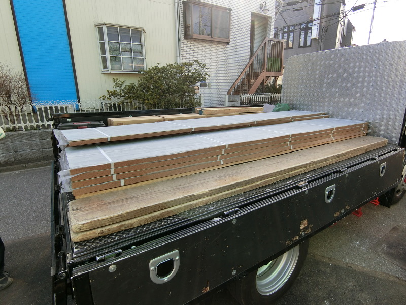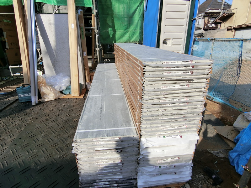 大型トラックに積まれたサイディング搬入がされ、これより外壁工事へと進みます。