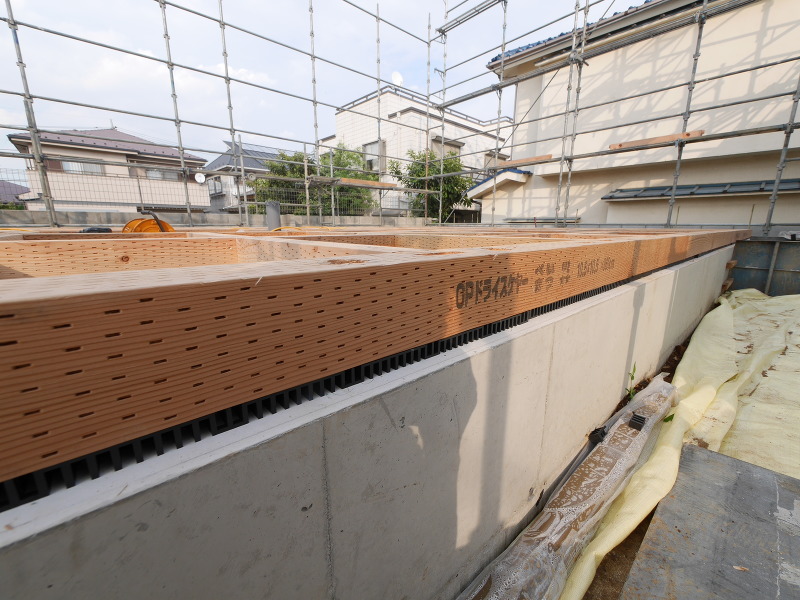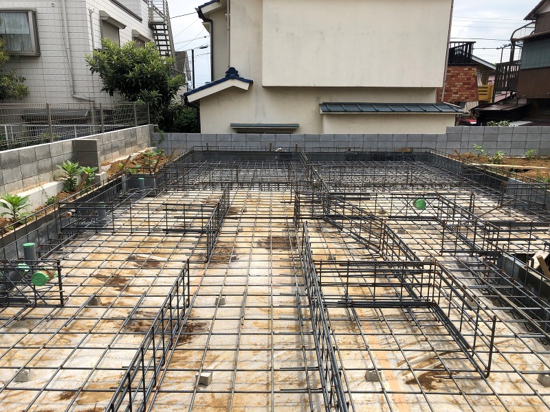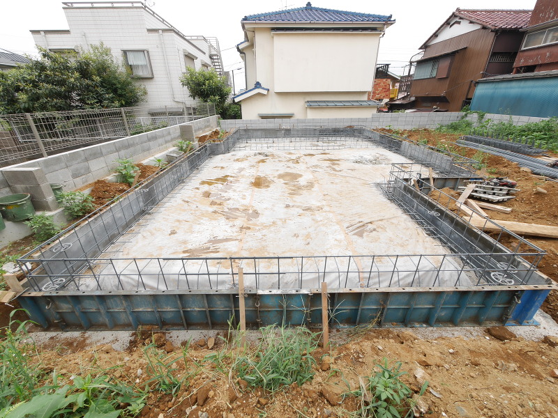基礎を打設する際、コンクリートから水分が地面に吸い込まれたり、地面からの湿気を吸い上げたりして水分量のバランスが変わり、基礎の強度を損なわれるのを防ぐために基礎の底全面に防湿シートを敷き上からコンクリートで固めます!