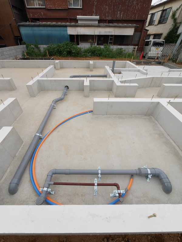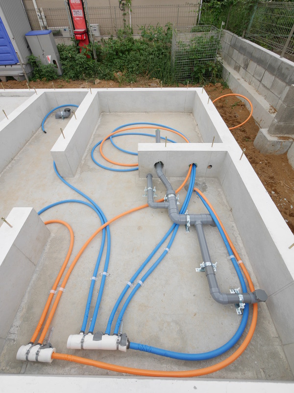 水廻りの排水管やガス管などを、予め床下に設置していく行程です。