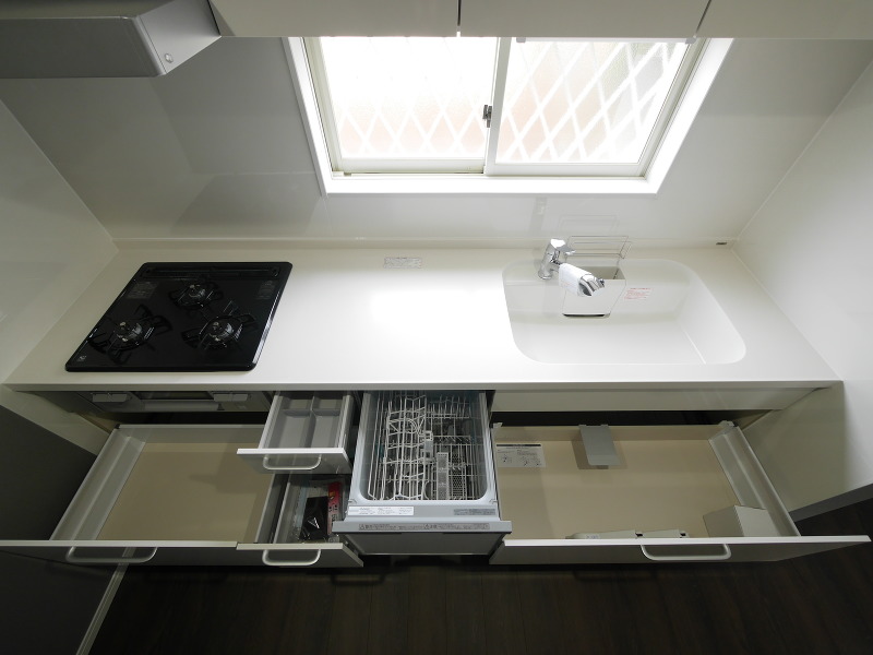 食洗機完備、スライド式の収納は大きな鍋やフライパンを仕舞っておくのにとっても便利!