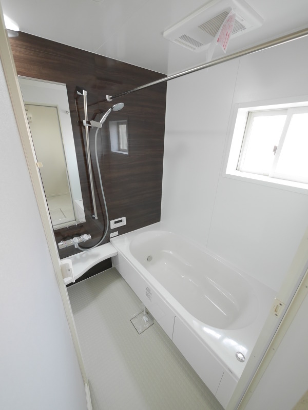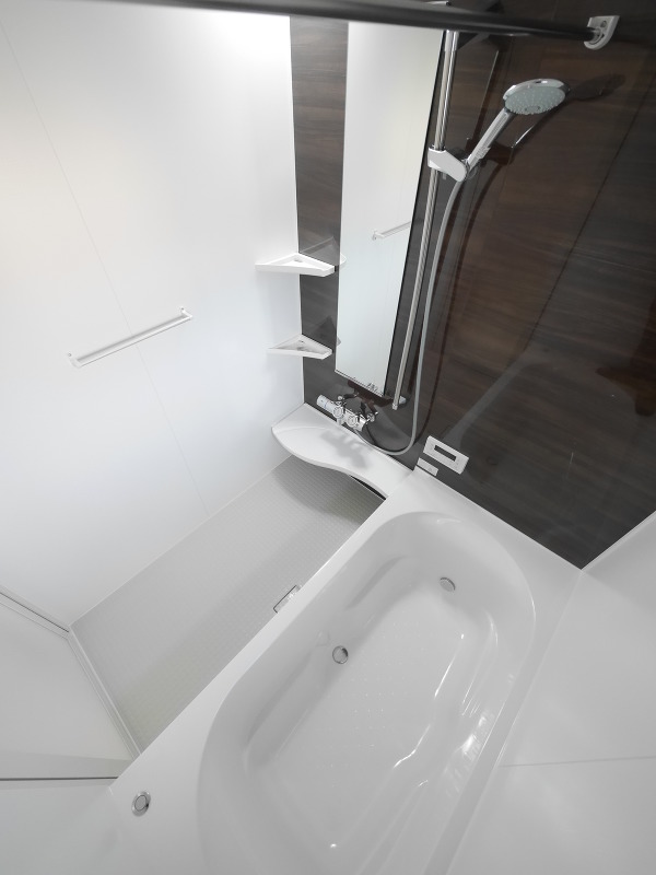 ユニットバスは木目のパネルに白い浴槽が映える素敵なバスルームに!