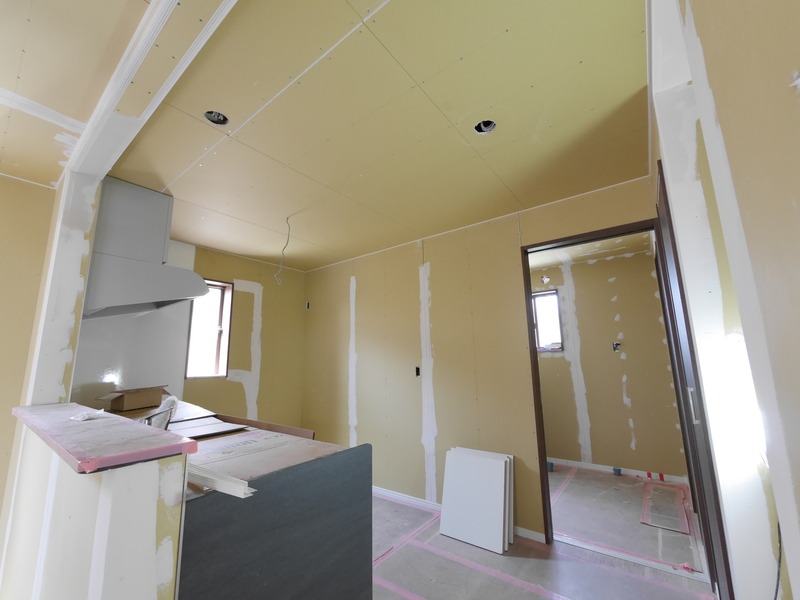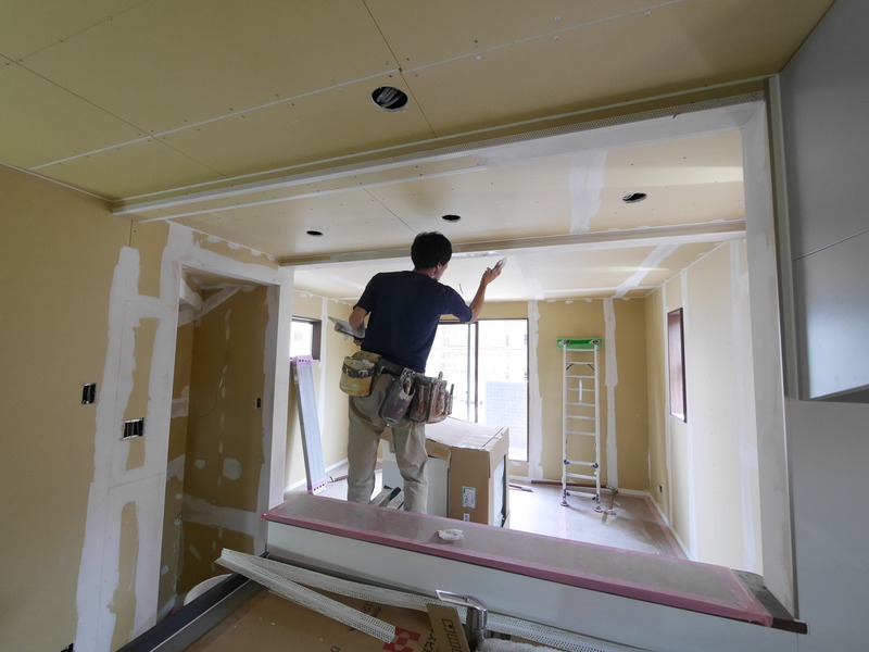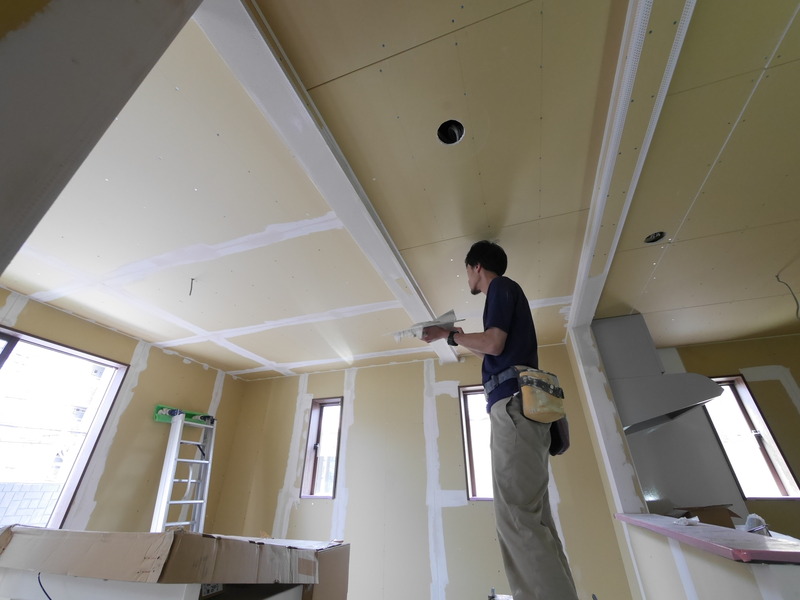 本日は、耐火ボードの目地や釘穴などをパテ埋めする工程が実施されていました☆