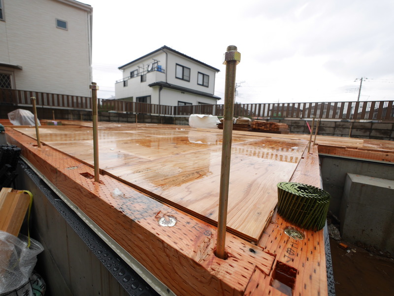 コンクリートから突き出ている大きなボルトは、アンカーボルトやホールダウン金物です。