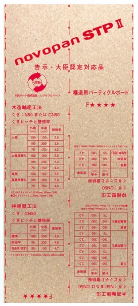 【nobopan STP2】は耐力壁として【国土交通大臣認定】を受けた構造用パーティクルボードで、耐力面材に求められるせん断性能が合板に比べて2倍以上あり、壁倍率が高く釘のピッチ変更で3種類の壁倍率を使い分けられる優れものです。