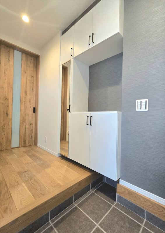 勿論壁には大容量のシューズBOX、鏡もついていますので、出かける前の