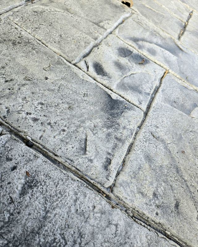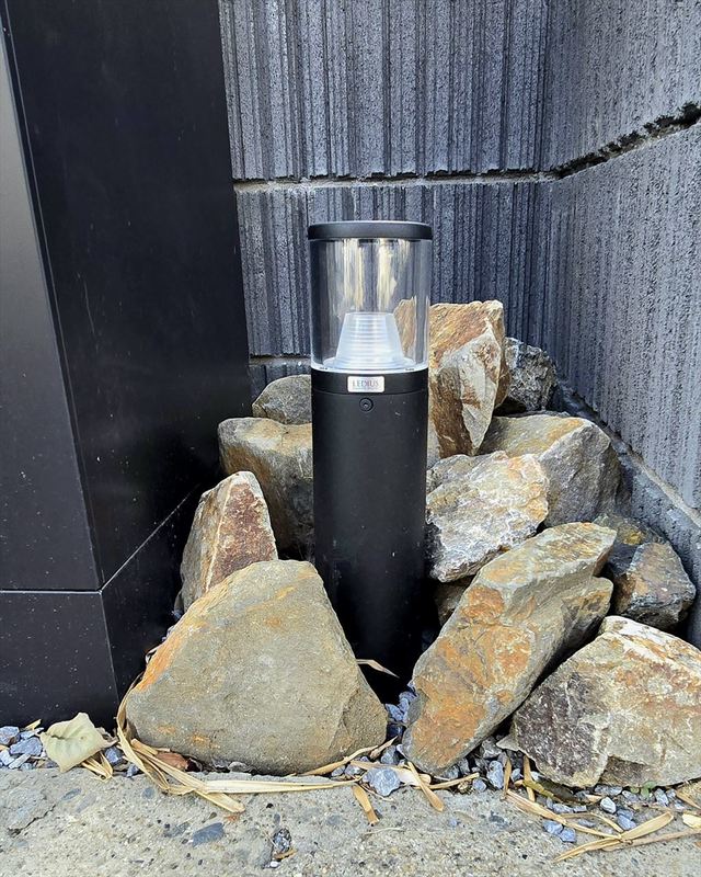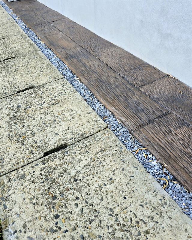 「スタンプコンクリート」を採用し、コンクリート打ちっぱなしでは出ない色彩を演出します。また、道路と敷地の間には、「地先」を設置する事が多いのですが、今回砂利を引くことで雨の日、敷地内コンクリートから流れる雨水を砂利でキャッチ♪